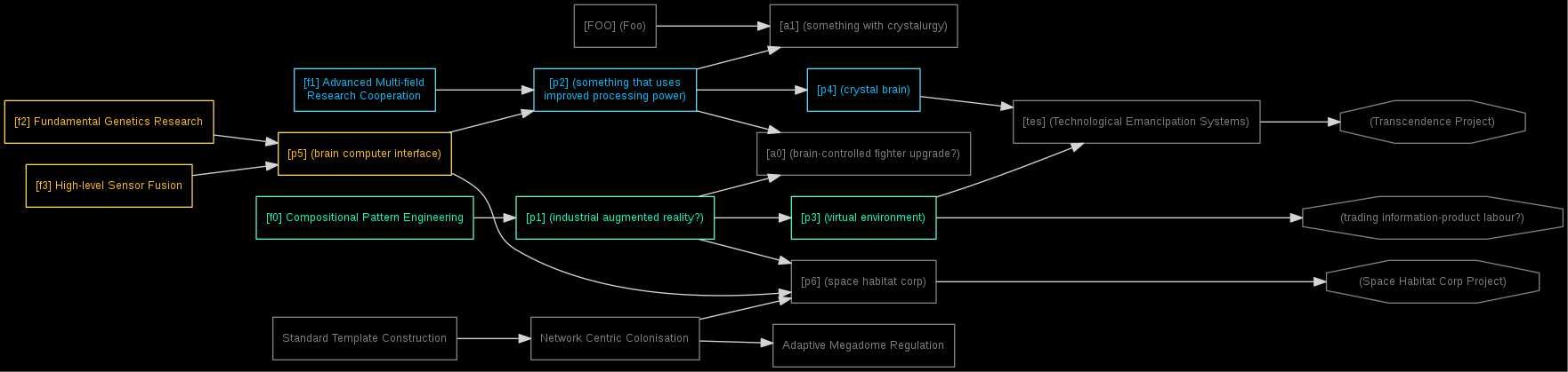 Unless you already have a very good idea of the shape and content of the tech tree, I propose to start work on the other side: instead of working your way up, work your way down. You know where you want to end, so this design process is about creating a set of technologies bridging the gap between the Transcendence project and the currently available techs. Using this inverted approach allows you to work in a more structured way: you can work out what conditions are necessary and which hurdles are in the way for the Transcendence project to be startable. (And some of these hurdles were even discusses in our previous discussion ^_^)